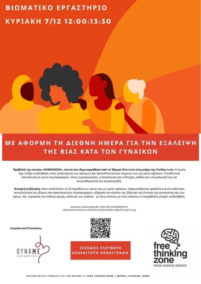 Kυριακή 7/12 12:00-13:30 H οργάνωση ΔΥΝΑΜΕ και ο κύκλος του βιβλιοπωλείου Free Thinking Zone μας προσκαλούν σε βιωματικό εργαστήριο, στο πλαίσιο των ημερών ακτιβισμού για την εξάλειψη της βίας κατά των γυναικών. Το πρόγραμμα περιλαμβάνει: Προβολή της ταινίας «ΚΛΙΜΑΚΩΣΗ», ταινία που δημιουργήθηκε από το Ίδρυμα One Love στη μνήμη της Υardley Love και ανοιχτή συζήτηση,…